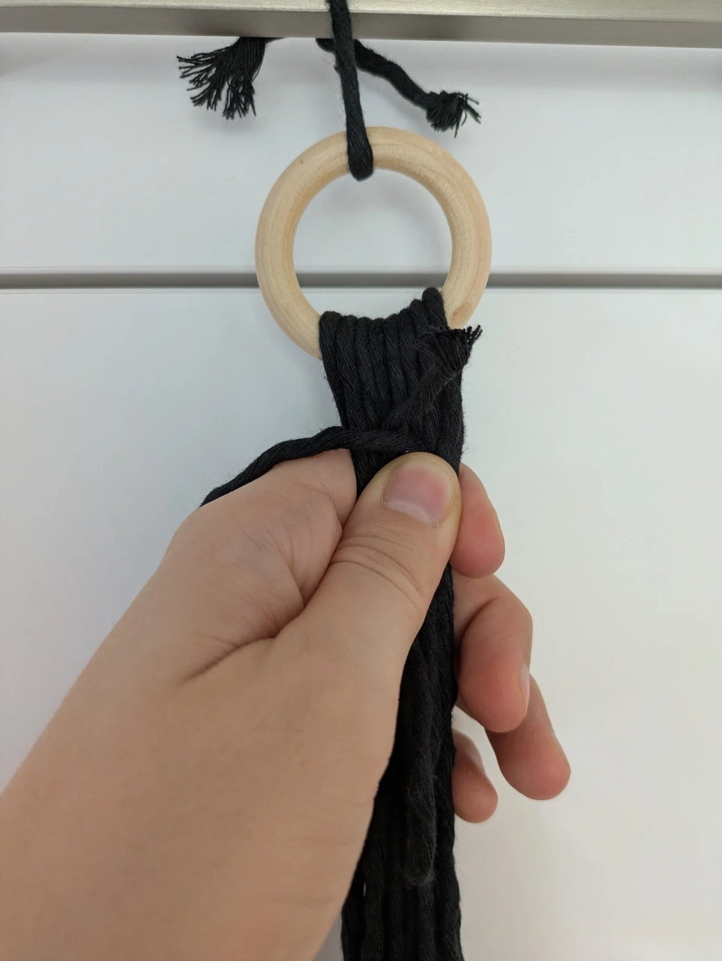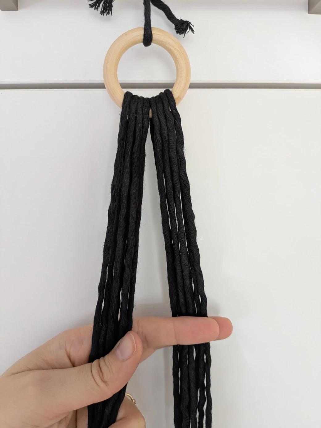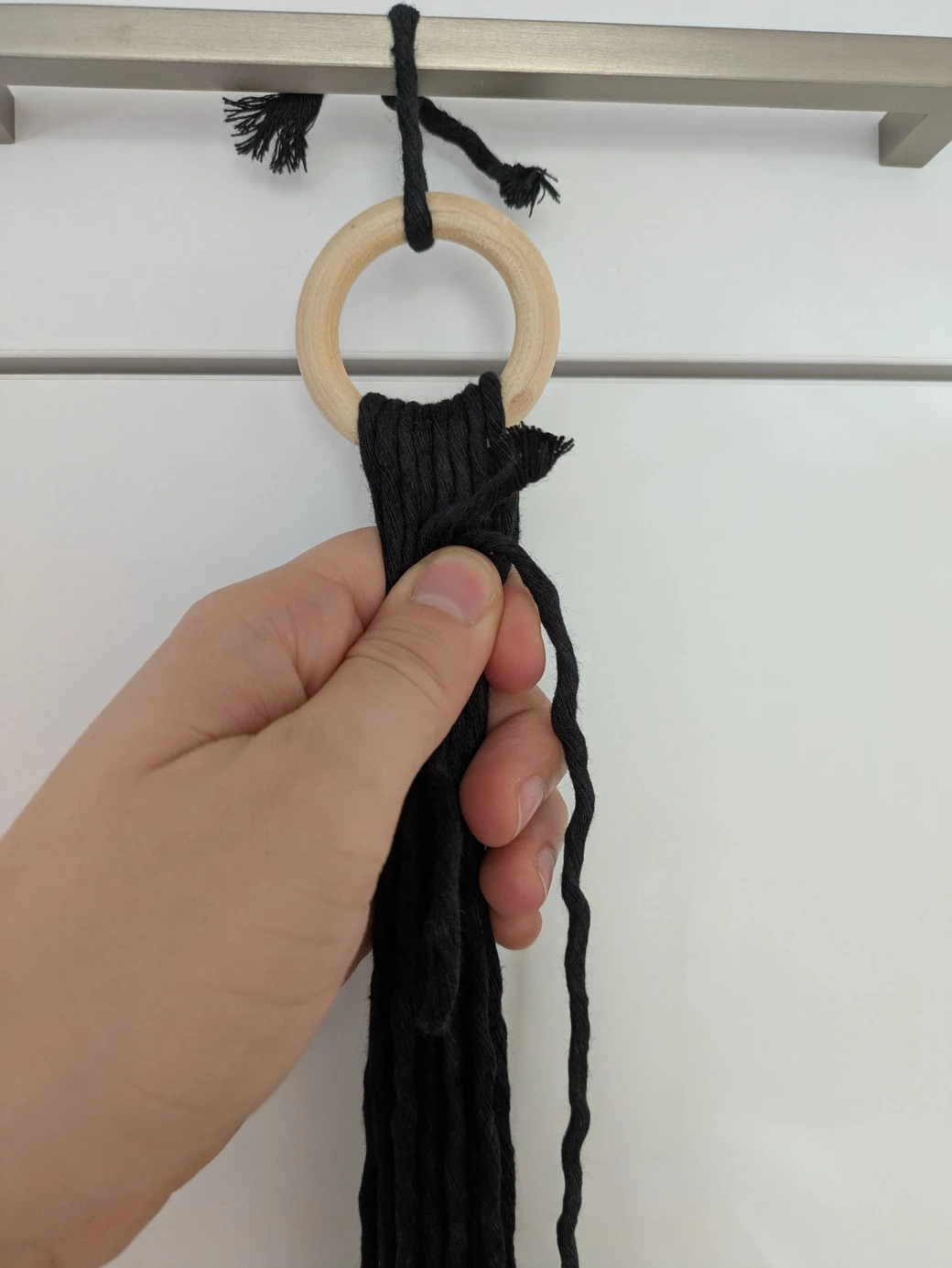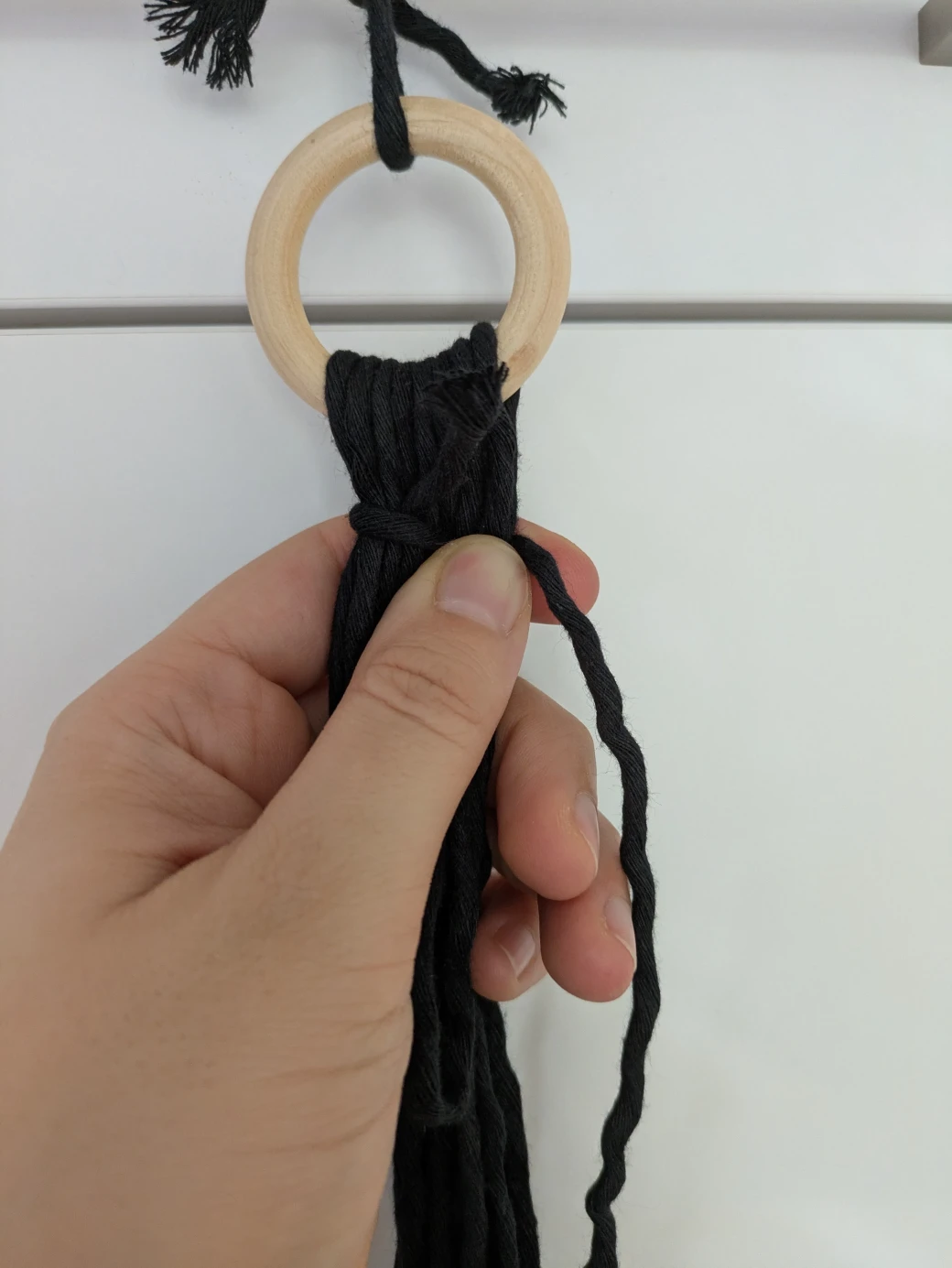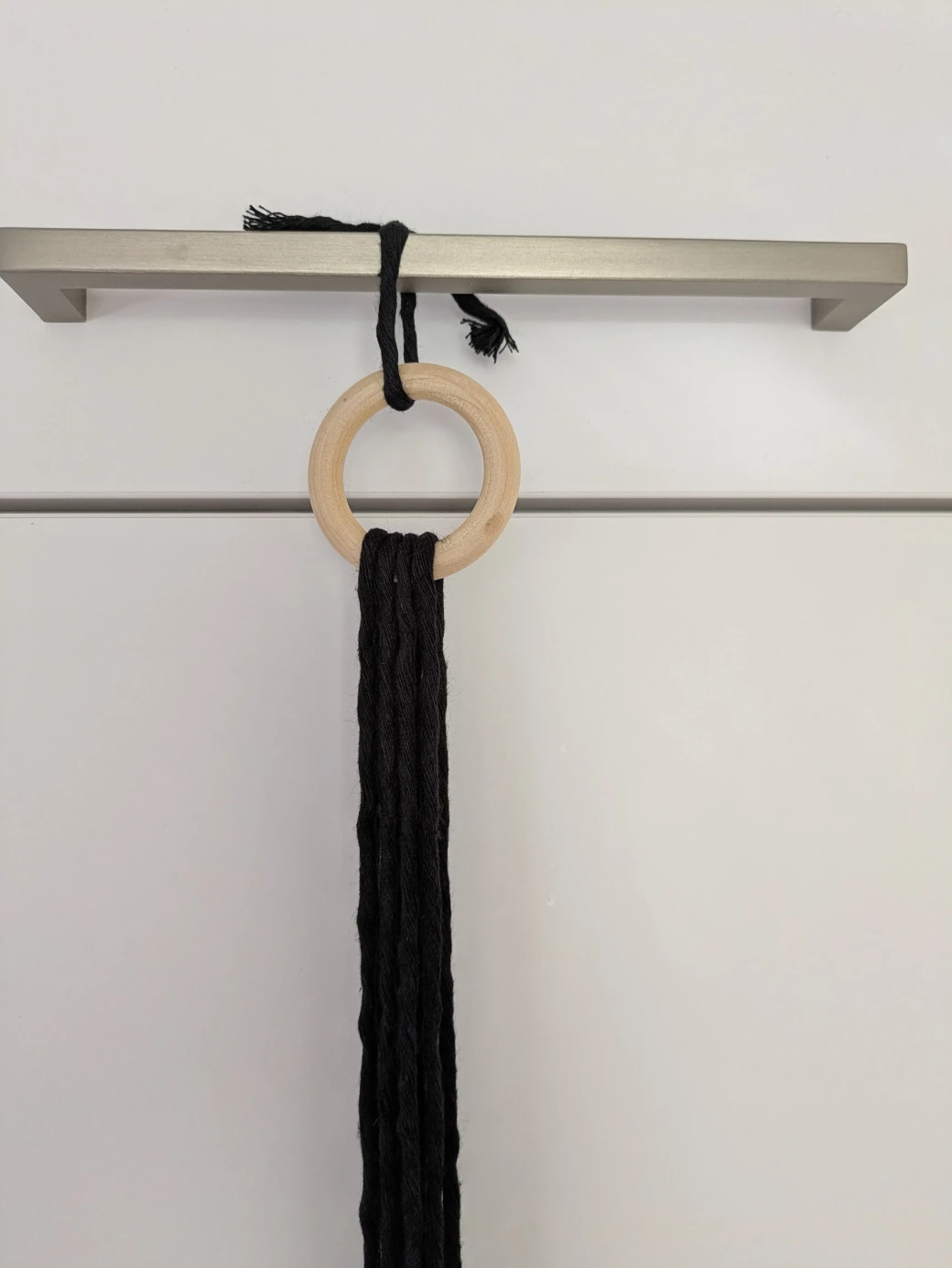 The next step is to prepare everything for knotting the hanging basket. It's best to first hang the wooden ring at about eye level; this is perfect for knotting. For example, I attached the wooden ring to a kitchen cabinet with a small piece of thread. Alternatively, you can also hang the ring over a coat hanger and then hang it on a door frame.