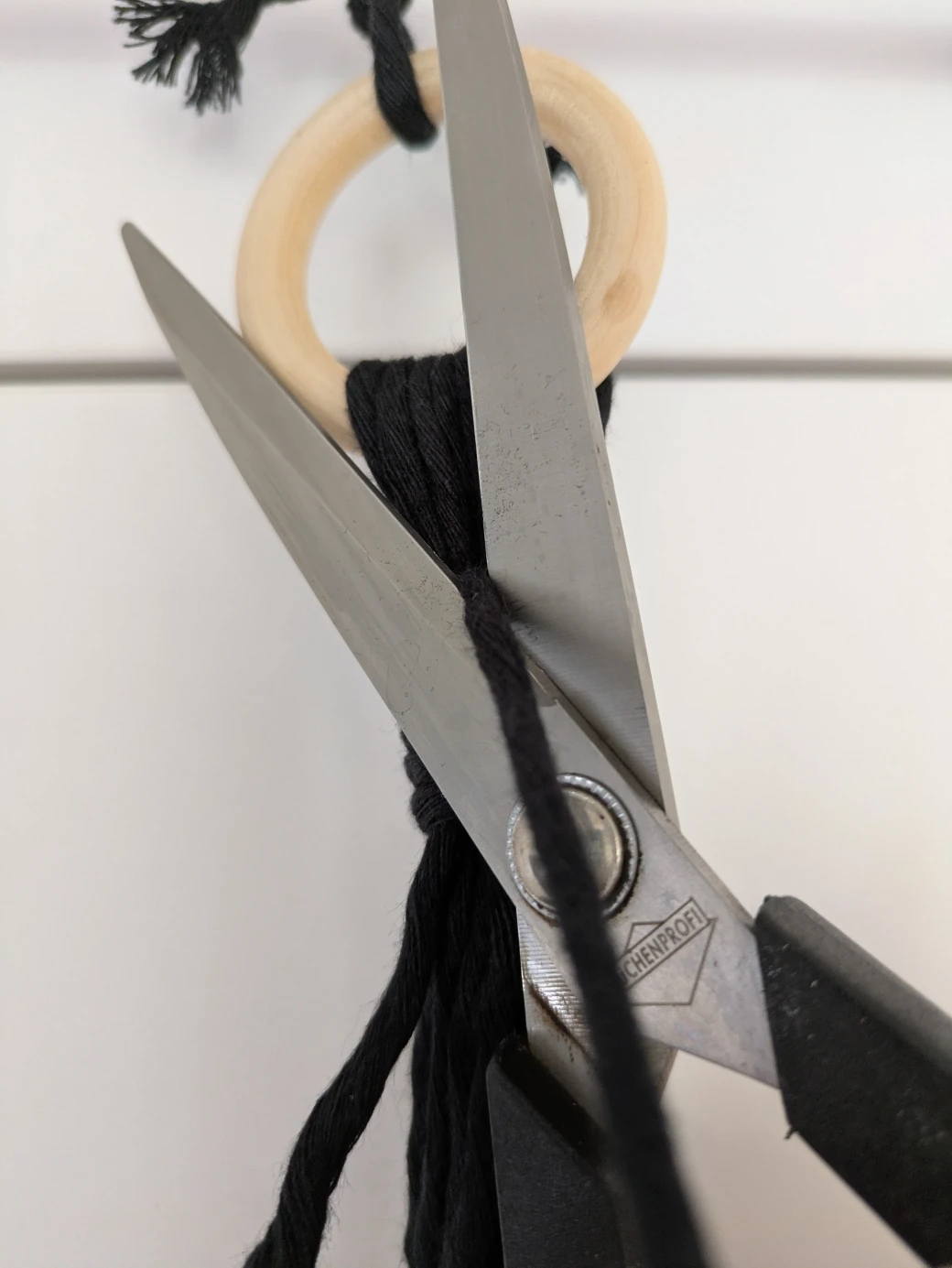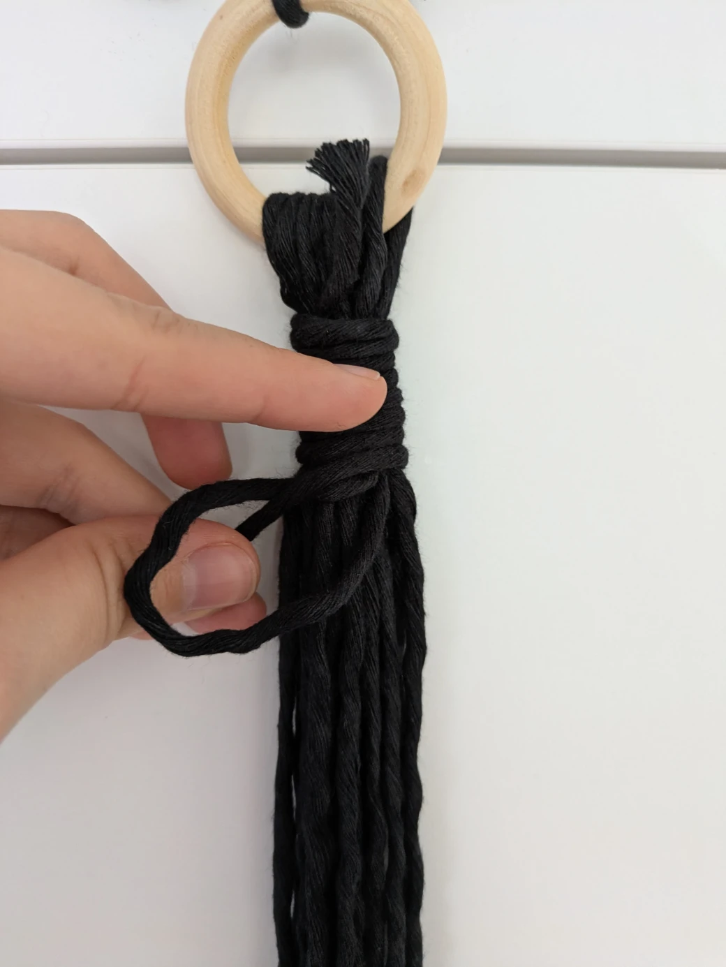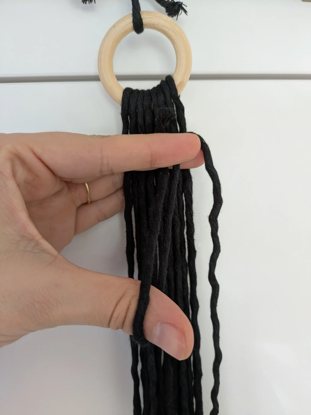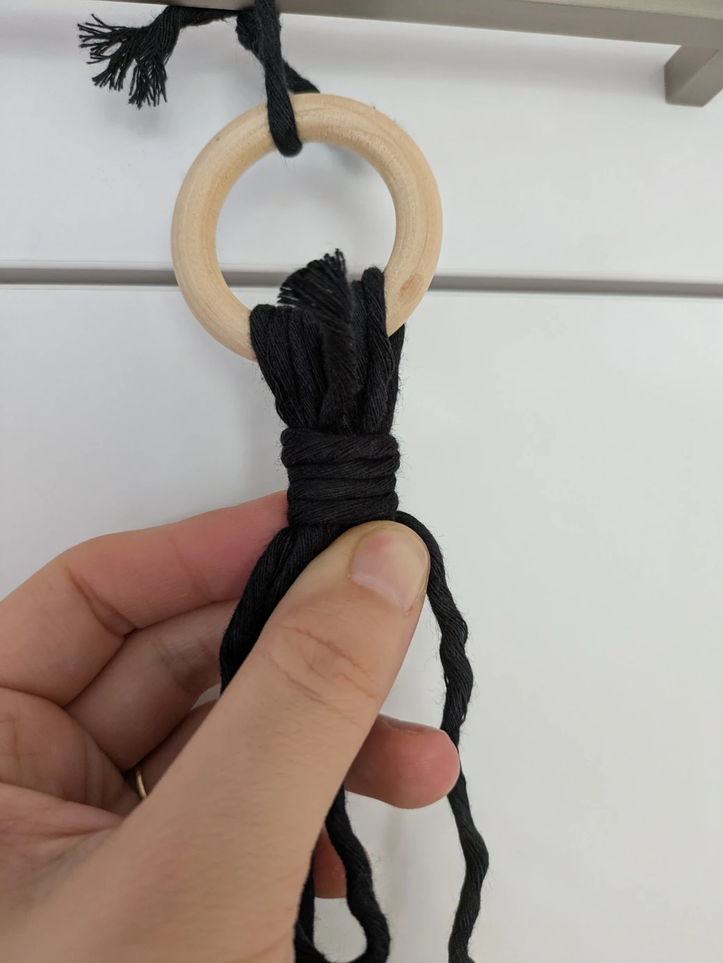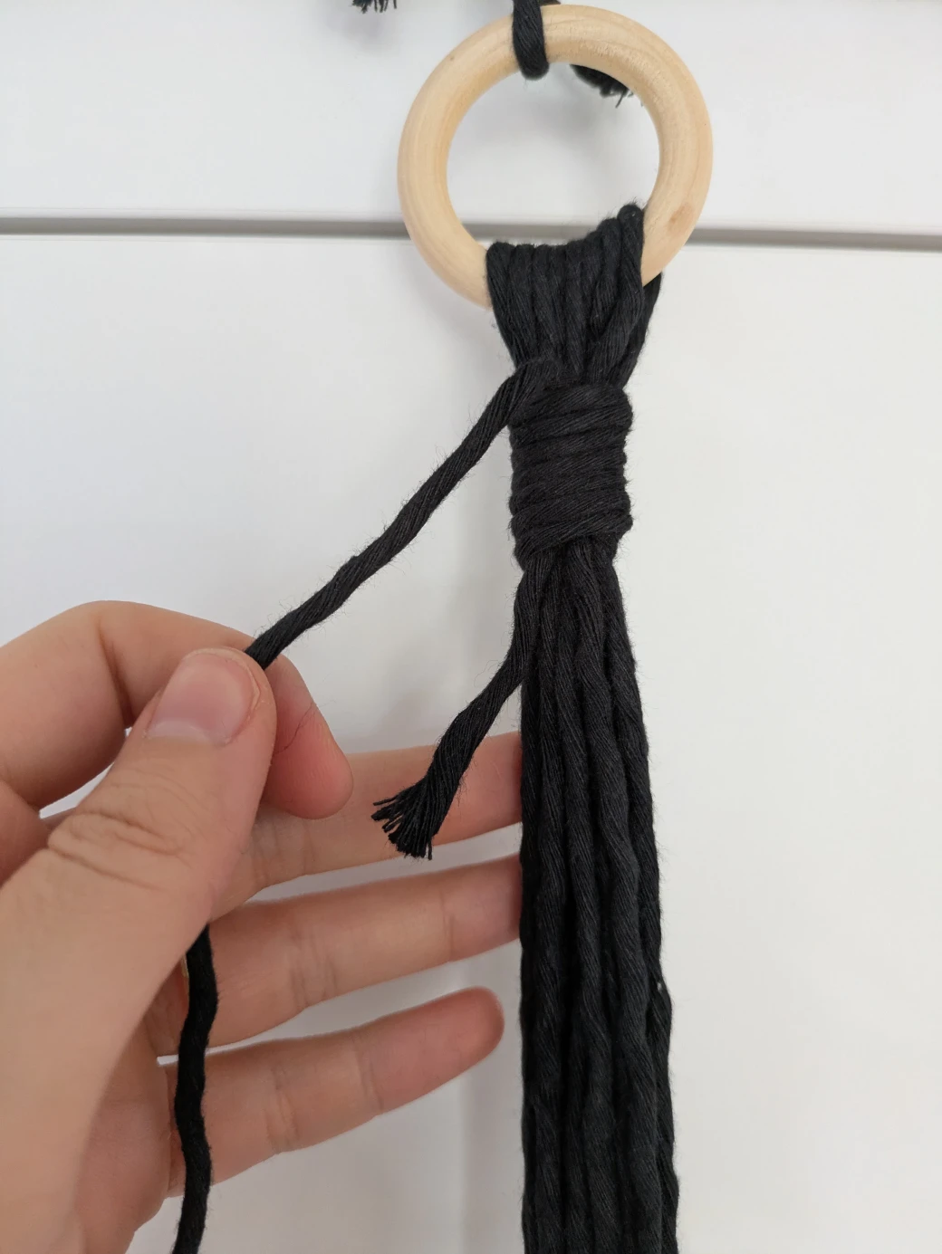 The next step is to prepare everything for knotting the hanging basket. It's best to first hang the wooden ring at about eye level; this is perfect for knotting. For example, I attached the wooden ring to a kitchen cabinet with a small piece of thread. Alternatively, you can also hang the ring over a coat hanger and then hang it on a door frame.