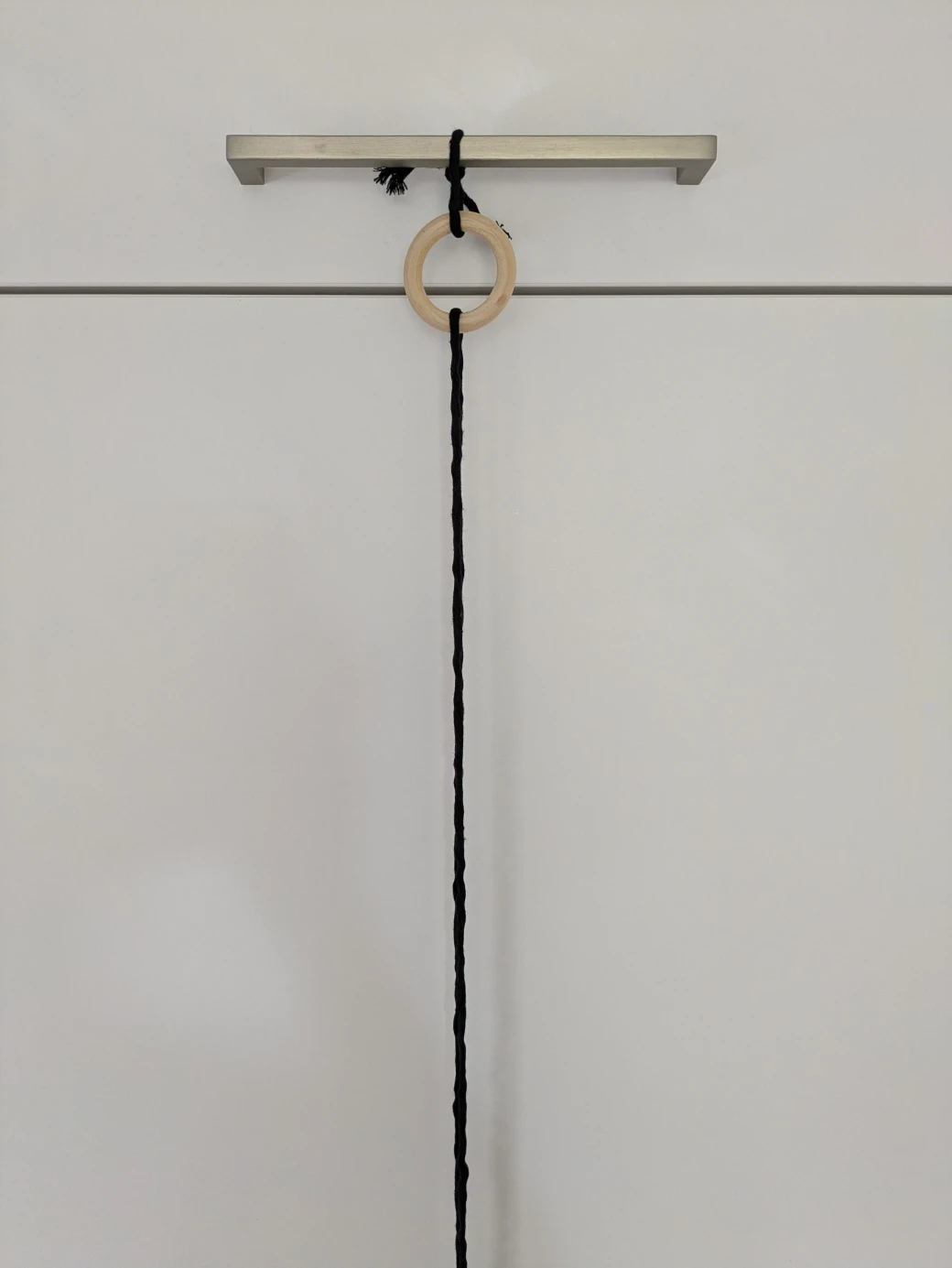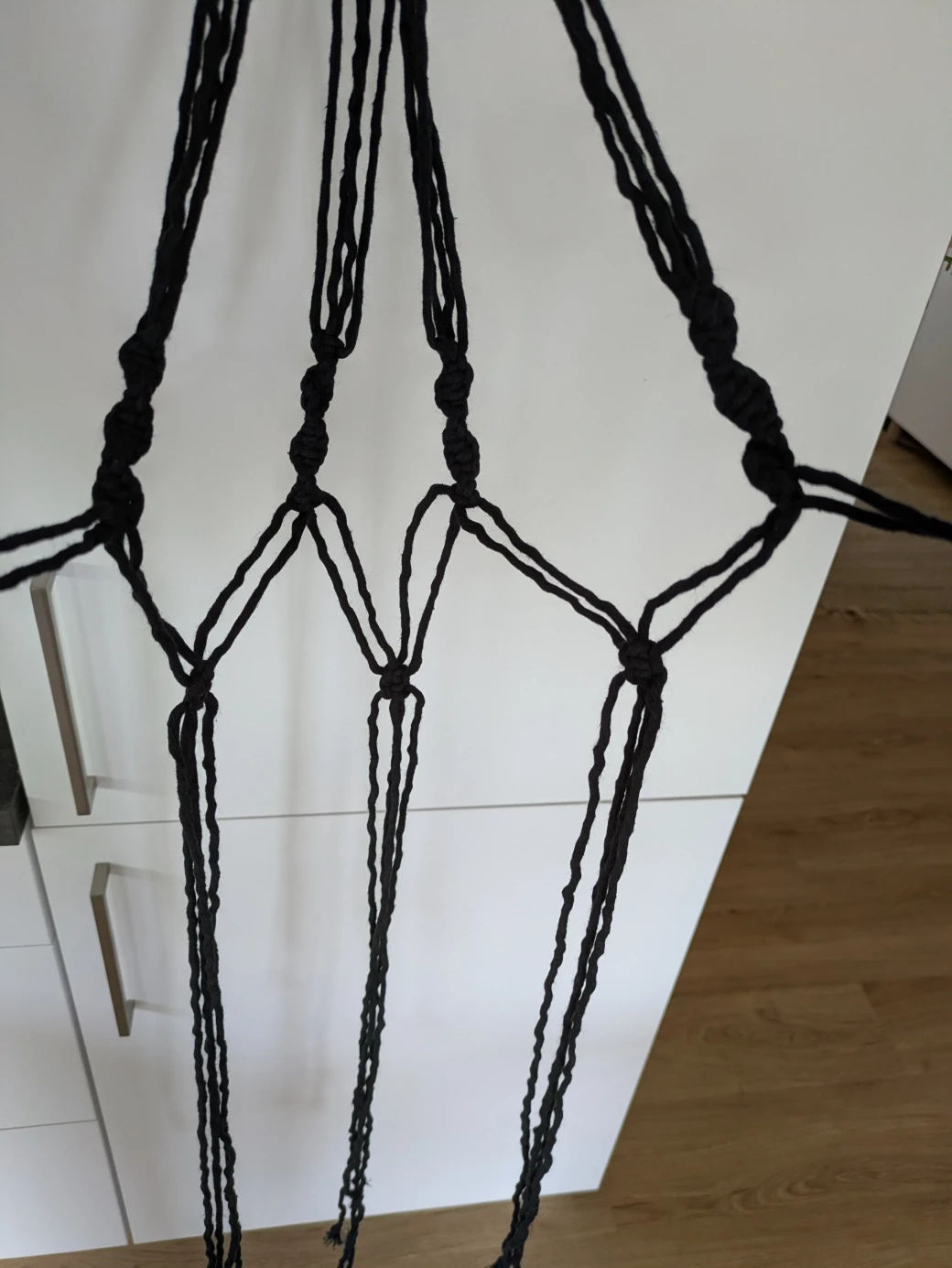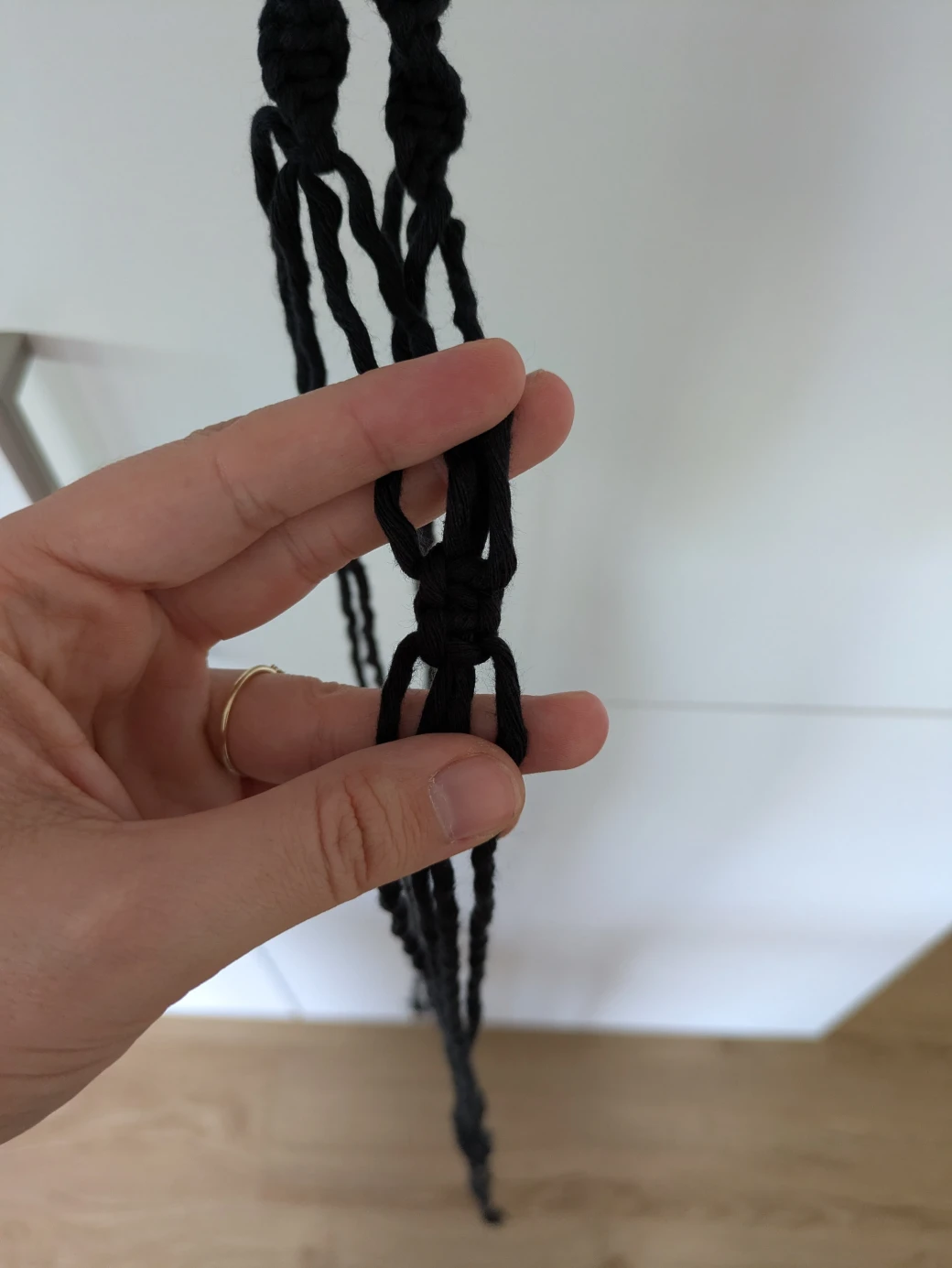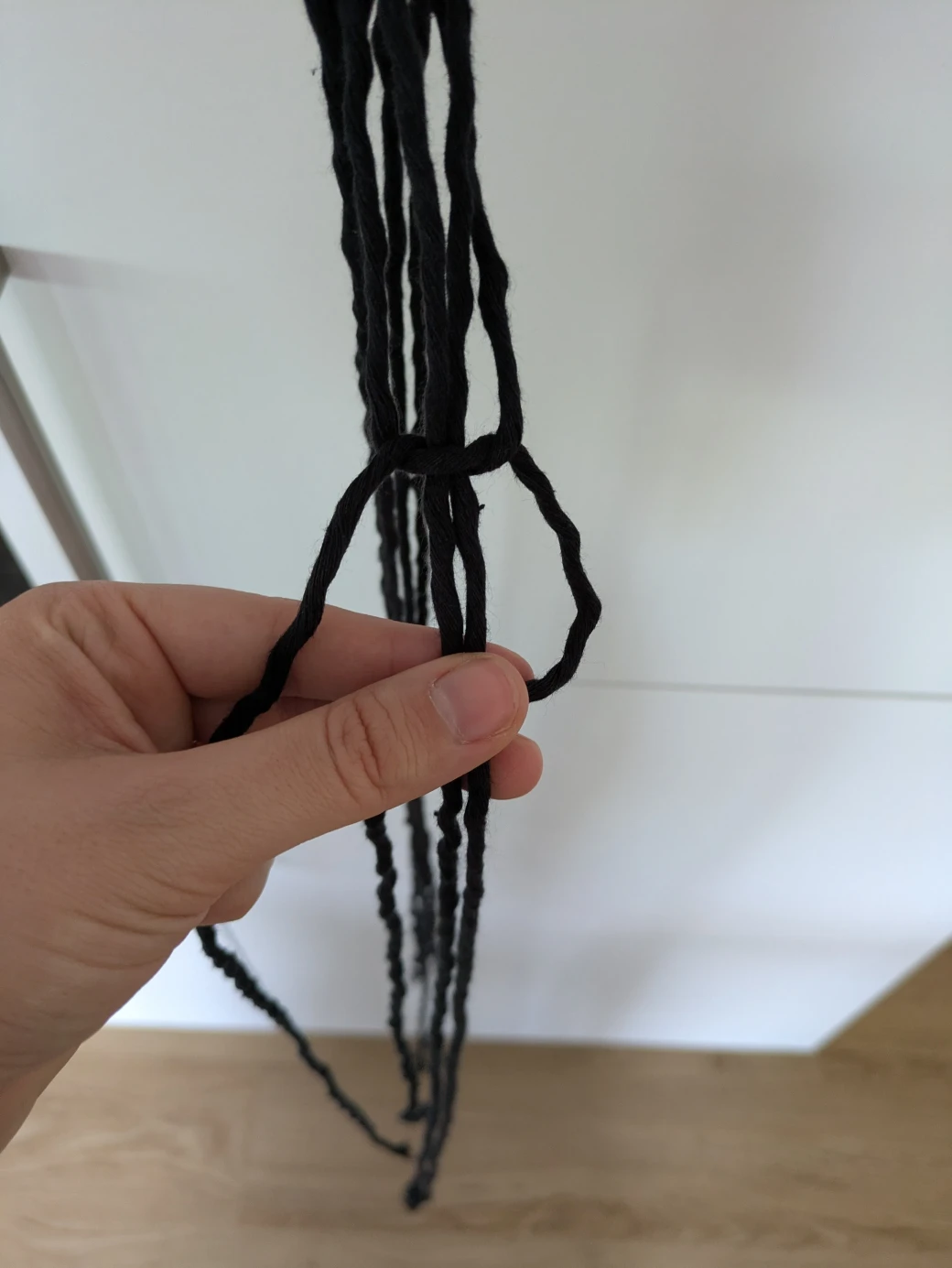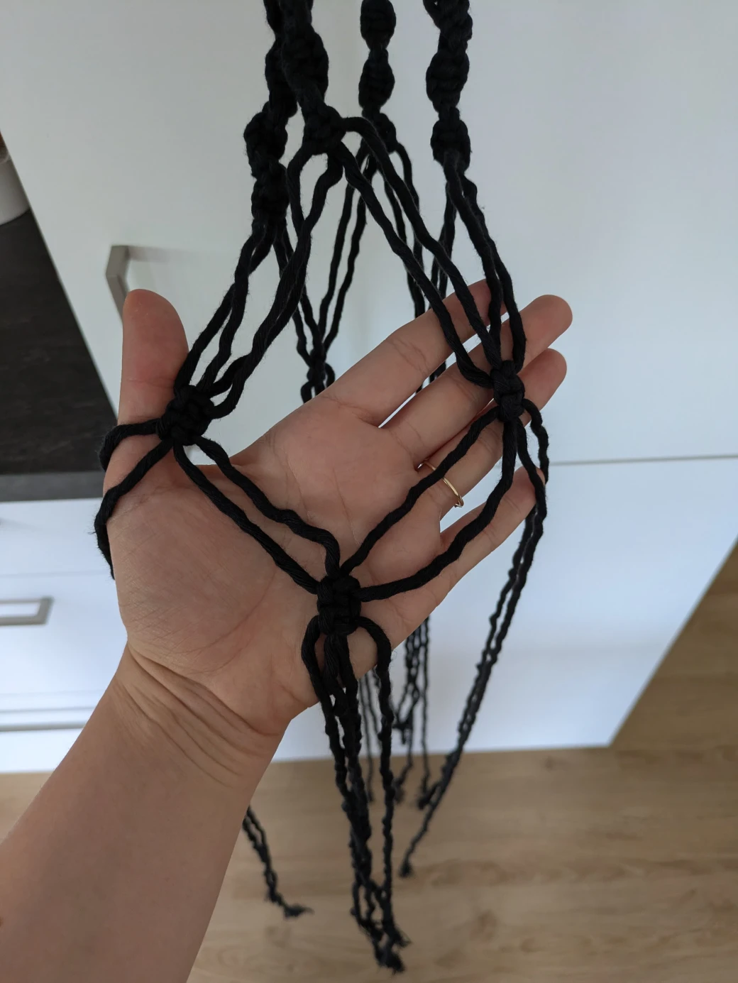 The next step is to prepare everything for knotting the hanging basket. It's best to first hang the wooden ring at about eye level; this is perfect for knotting. For example, I attached the wooden ring to a kitchen cabinet with a small piece of thread. Alternatively, you can also hang the ring over a coat hanger and then hang it on a door frame.