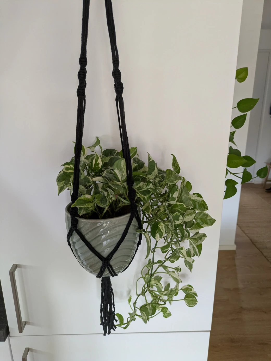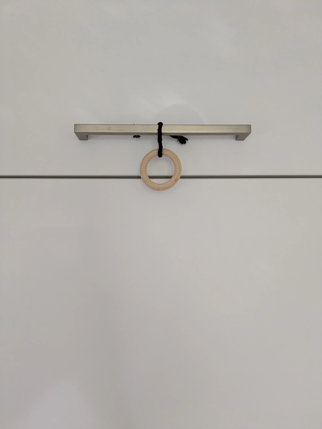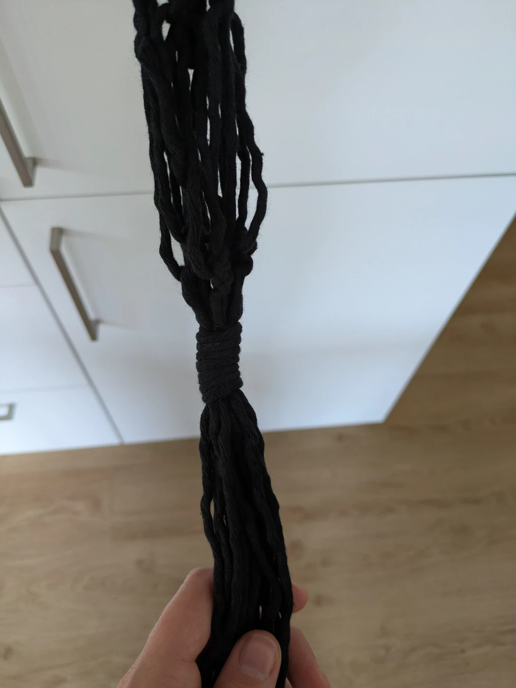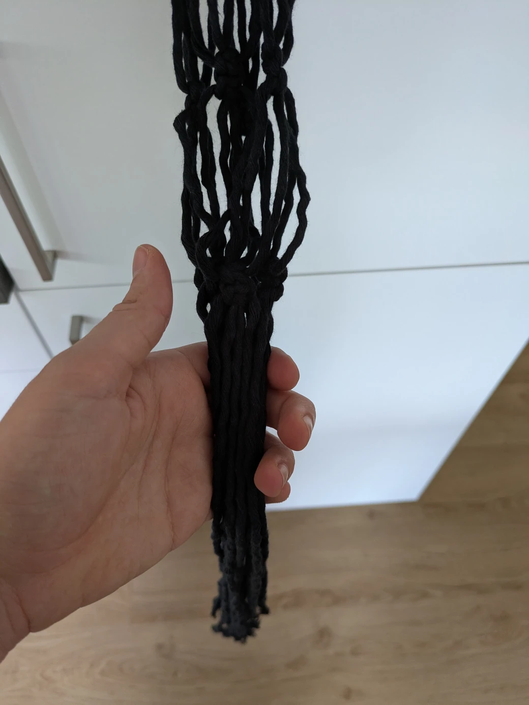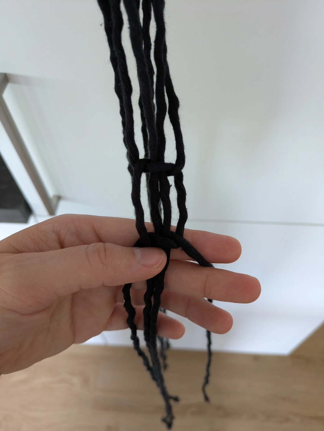 The next step is to prepare everything for knotting the hanging basket. It's best to first hang the wooden ring at about eye level; this is perfect for knotting. For example, I attached the wooden ring to a kitchen cabinet with a small piece of thread. Alternatively, you can also hang the ring over a coat hanger and then hang it on a door frame.