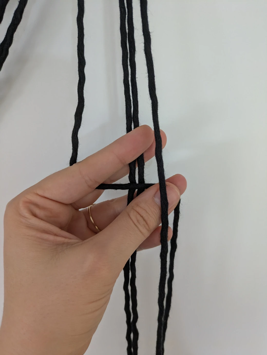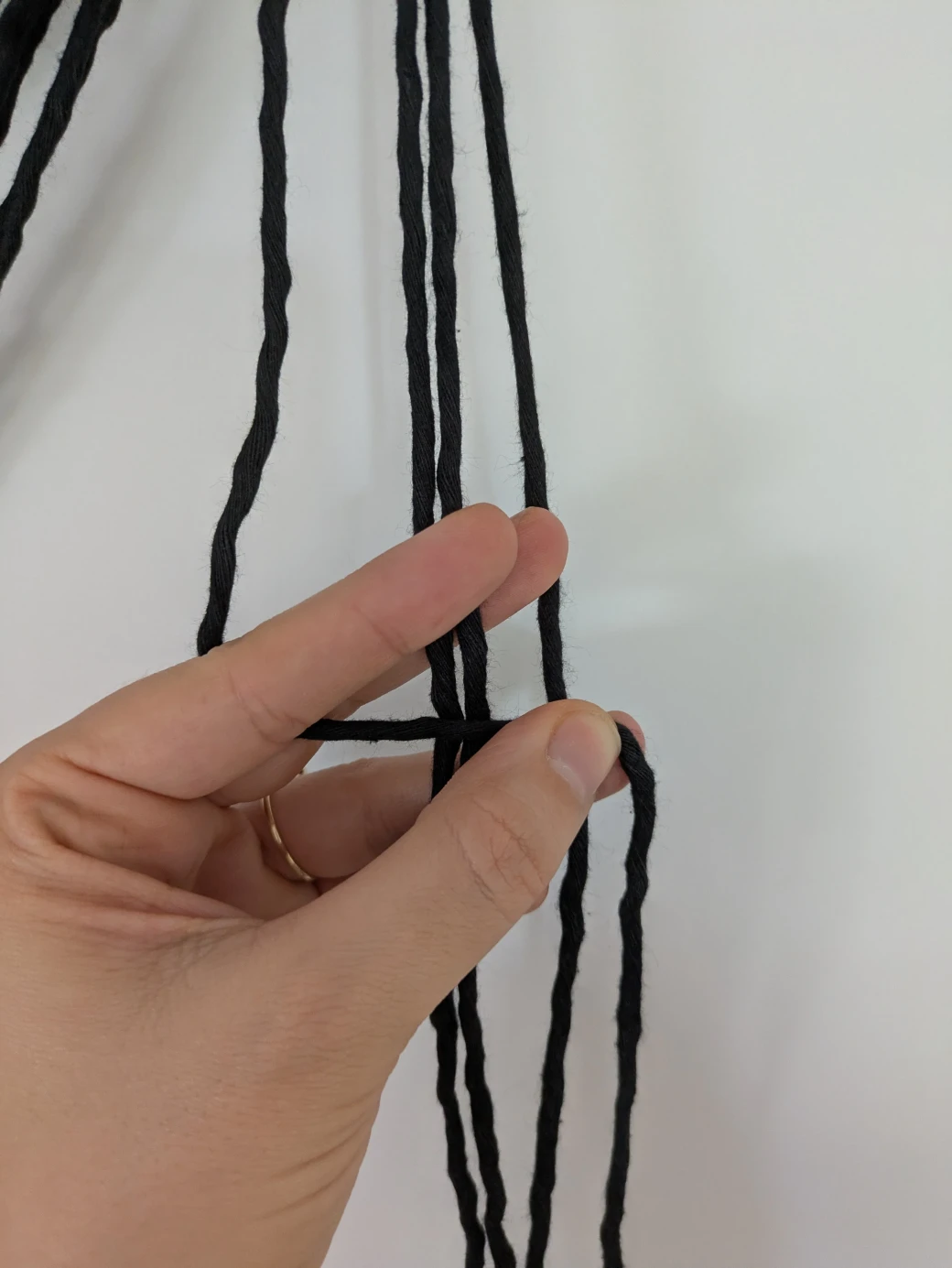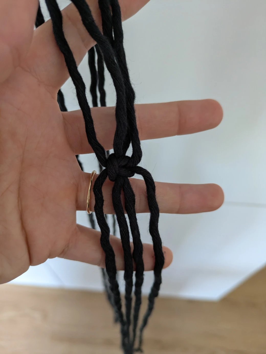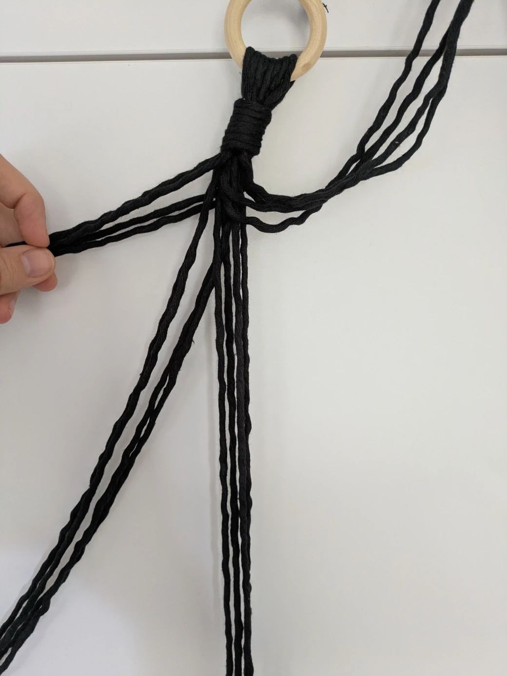Now that the wrapping knot has connected all the threads to the wooden ring, it's time to begin tying the actual hanging basket. To do this, all 16 threads are first divided into four groups, each with two long working threads and two short filling threads.