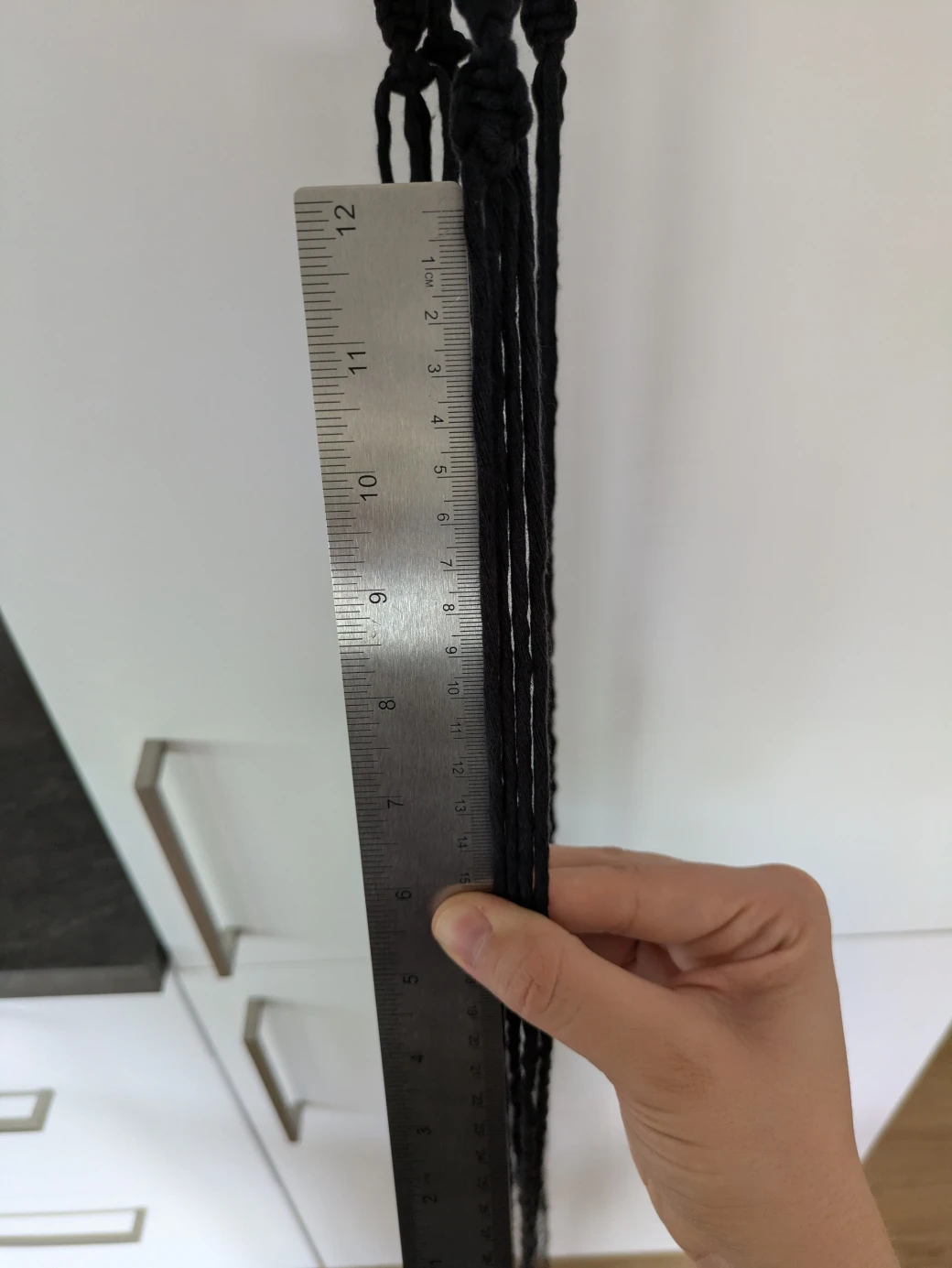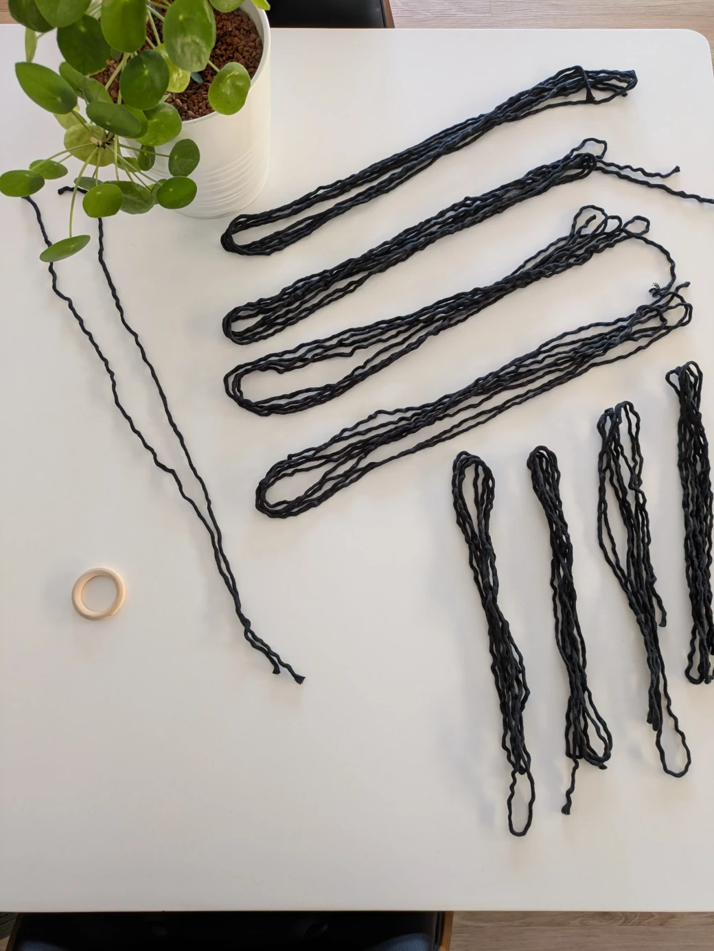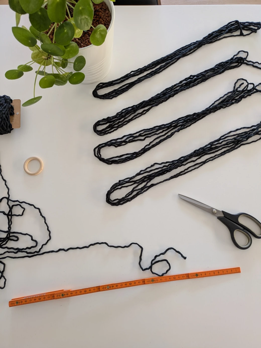 The first step is to measure and cut the macrame yarn. For this hanging basket, we need four 4m long working threads, four 2.5m long filling threads, and two 60cm long threads for tying the wrapping knots at the beginning and end of the basket.