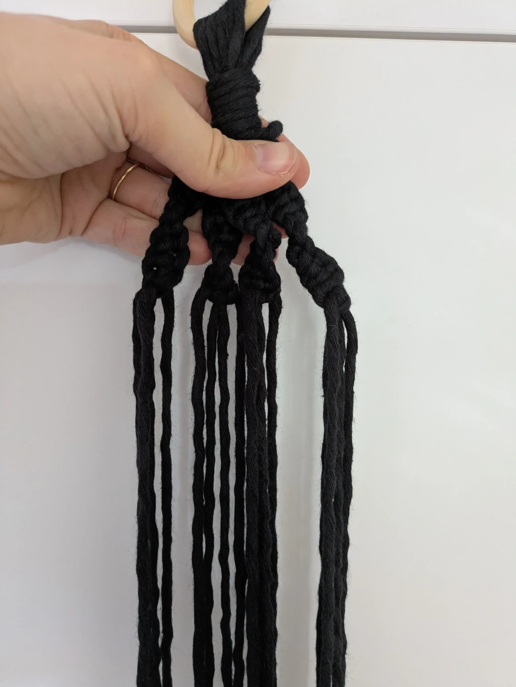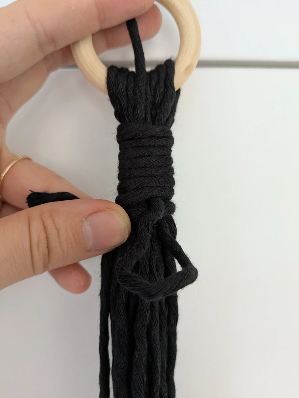 To begin the hanging basket, first use a wrapping knot to securely connect all the threads and attach them to the wooden ring.