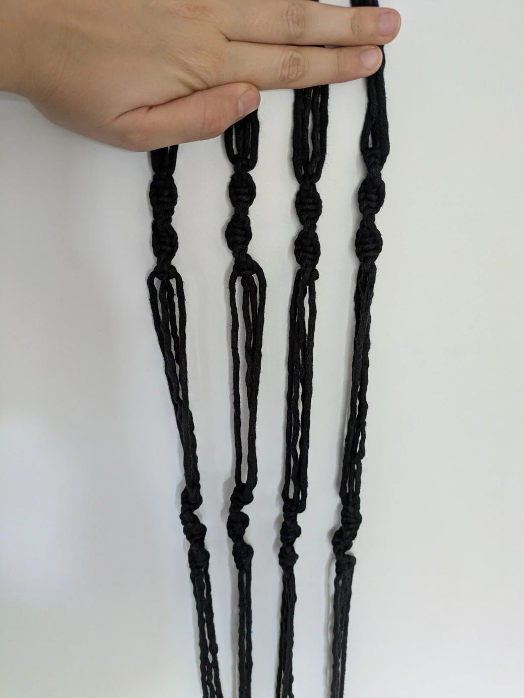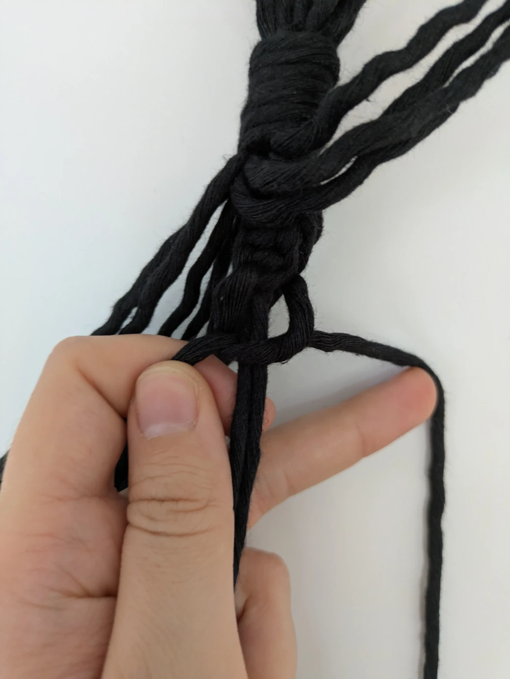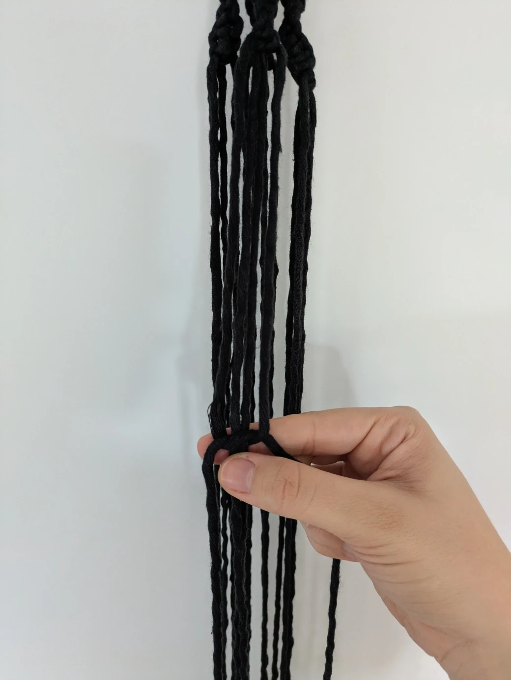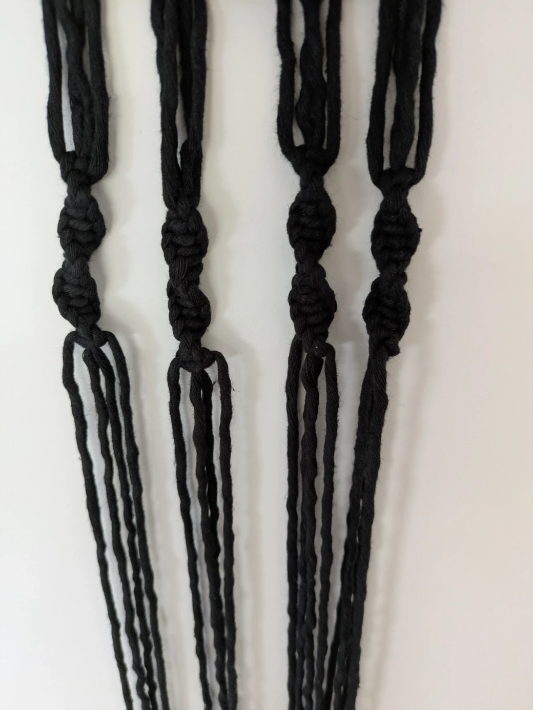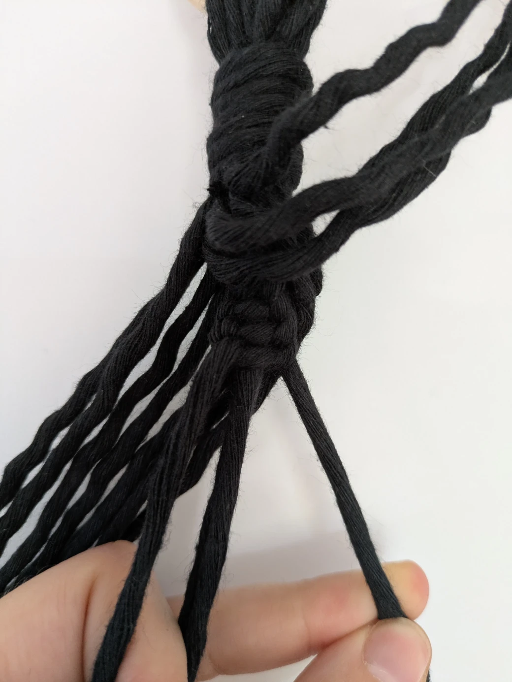 After the approximately 5cm spiral knots are tied on the first thread group, repeat this process for the remaining three thread groups. Make sure the knots all start at a similar height.